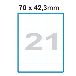 Cenovo výhodné etikety na hárkoch A4 vhodné do laserových a atramentových tlačiarní, ako aj kopírovacích strojov. Rozmer etikety 70×42,3 mm, počet etikiet na hárku 21, balenie 100 hárkov.
