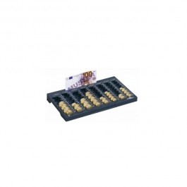 Samostatná mincová priehradka z tvrdého plastu, rozmerovo vhodná do bežnej stolovej zásuvky. Osem oddielov na eurá a centy v maximálnej hodnote 233,90 Euro, priehradka na bankovky, poukážky alebo stravné lístky vo vrchnej časti. Rozmery 324 x 34 x 190 mm.