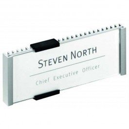 Informačná tabuľka na dvere. Štylizovaná tabuľka vo vrúbkovanej úprave, spodná časť z vysoko kvalitného hliníka, fixujúce spojky v čiernej farbe. K podkladu môže byť zadnou časťou priskrutkovaná alebo nalepená. Text je chránený neoslňujúcim akrylátovým krytom, ktorý pridržiavajú dve fixujúce spojky. Súčasťou balenia je montážna sada s názorným návodom a čistým listom papiera vo veľkosti tabuľky. Rozmery: 149×52,5 mm Úprava: vrúbkovaná Uchytenie: skrutky, lepenie