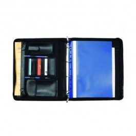 Portfólio so zipsom, formát A4. Vybavené 4-krúžkovou mechanikou, poznámkovým linajkovým blokom,úchyty na písacie potreby. Obsahuje vrecká na dokumenty a vizitky.Farba čierna. Rozmery: 350 x 295 x 50 mm.