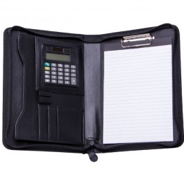 Portfólio so zipsom, rozšírený formát A5. Vybavené kalkulačkou, poznámkovým blokom, vreckami niekoľkých veľkostí, uškami na perá a podložkou s klipom. Prevedenie imitácia kože.