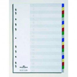 Farebný rozraďovač bez popisu pre 20 oddielov z polypropylénu. Euro-dierovanie, popisovateľný papierový titulný list. Formát A4. Balenie jedna sada v polyesterovom sáčku. Počet sád v kartóne 25. Farba: 20 farieb Formát: A4