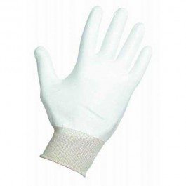 Pletené, bezšvové, nylonové rukavice s tenkou vrstvou polyuretánu v dlani a na prstoch a pružnou manžetou.