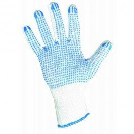 Pletené bezšvové rukavice, zo zmesi polyester/bavlna s PVC terčíkmi v dlani a na prstoch