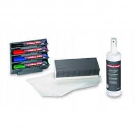 Praktická štartovacia sada doplnkov pre magnetické tabule obsahuje čistiaci sprej BMA 1, čistiacu stierku BMA 2 s 20 náhradnými papierikmi, držiak popisovačov BMA 3 a 4ks popisovačov na biele tabule edding 360.